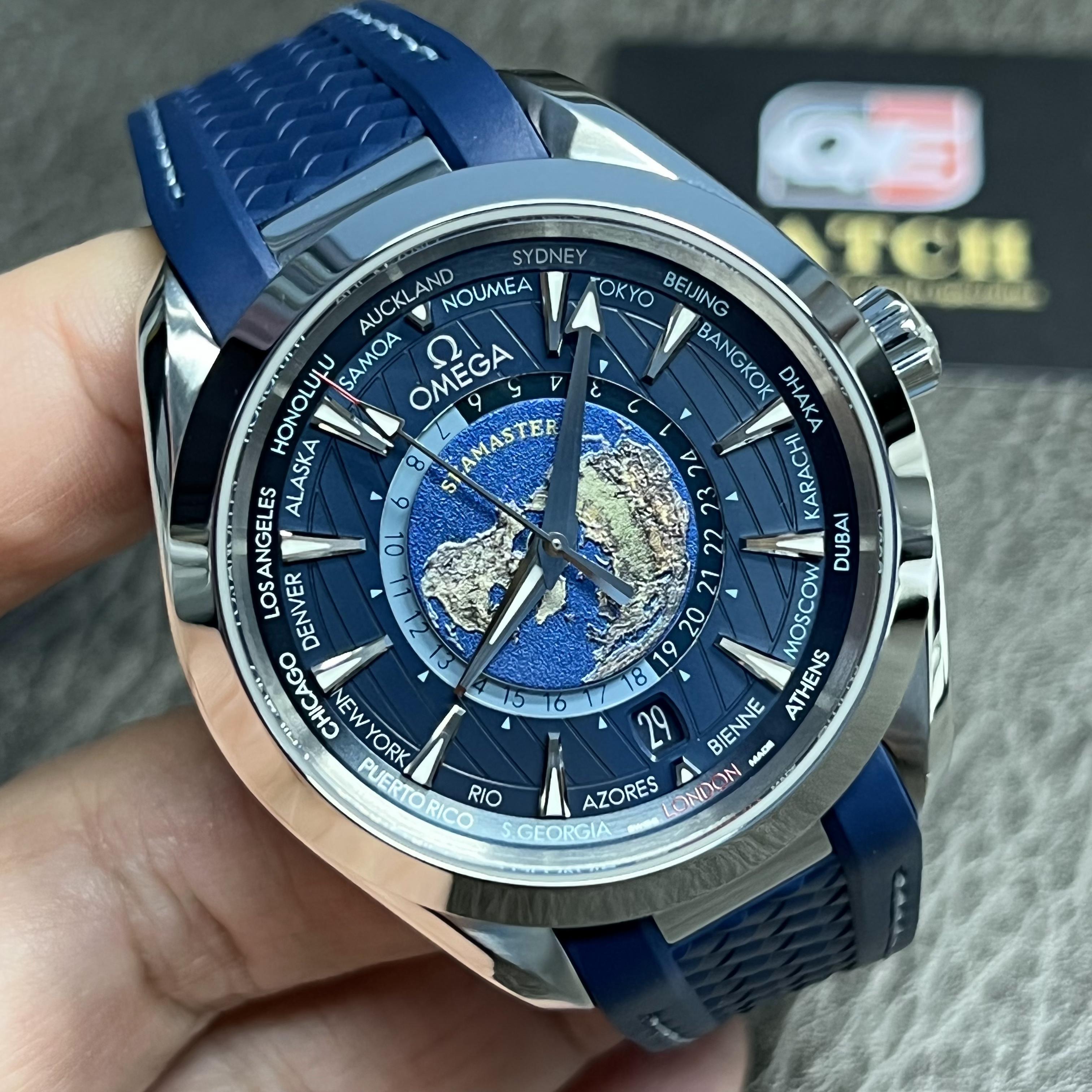 オメガ シーマスター アクアテラ 150m コアクシャル マスタークロノメーター GMT ワールドタイマー ブルー ラバーストラップ 43mm スーパークローン